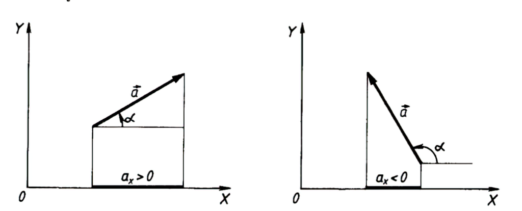 Проекцией вектора а на ось ОХ называется скалярная величина ax=acosα, где α — угол, отсчитываемый от положительного направления оси ОХ против часовой стрелки до направления вектора.
